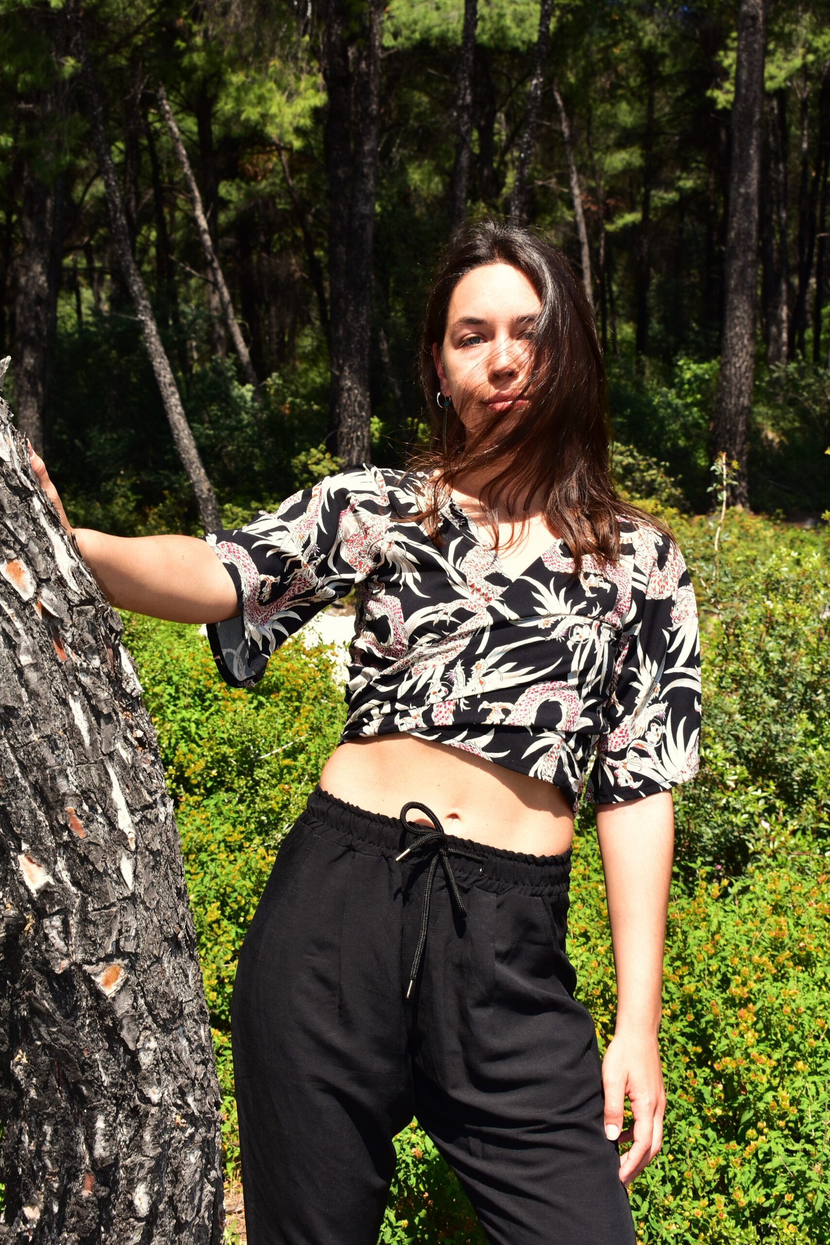 Natsumi crop top black Dragons 100% viscose of Greek manufacture Model’s height 1.70 , wearing S/M